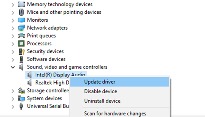 Bước 3: Nhấp chuột phải vào Realtek High Definition Audio hoặc Intel Display Audio, chọn Update driver.