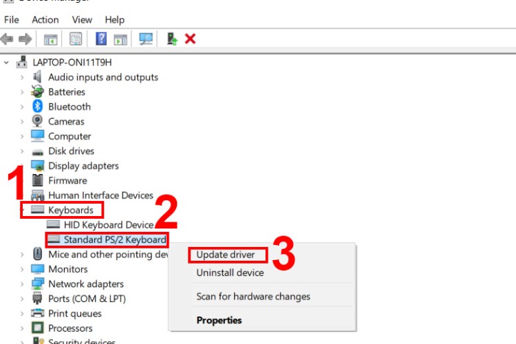 Bước 2: Mở cửa sổ Device Manager chọn Keyboards sau đó chọn Standard PS/2 Keyboard. Tiếp theo, nhấn chọn Update driver.