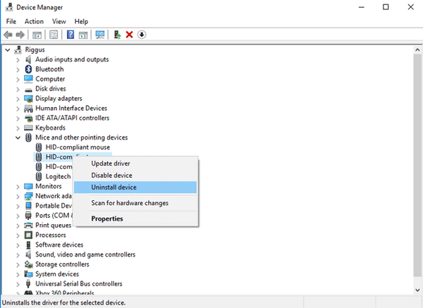 Nhấn chuột phải vào tên chuột > chọn Uninstall device