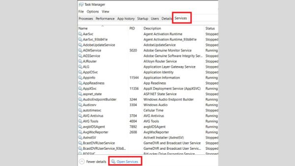 Mở Task Manager > chuyển sang tab Services
