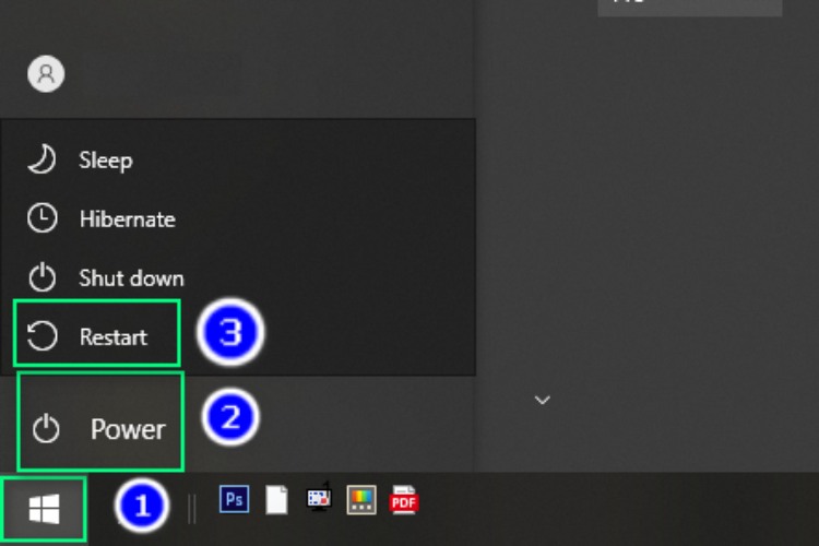 Bước 1: Nhấn vào biểu tượng “Start” tiếp tục chọn “Power” nhấp vào “Shut down” để tắt máy tính.