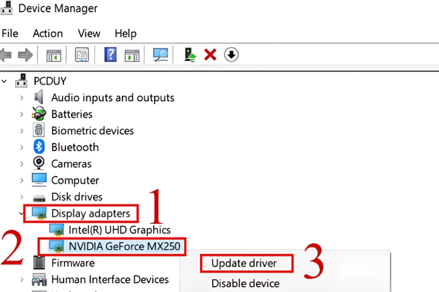 Bước 2: Mở rộng mục Display Adapters, nhấp chuột phải vào card đồ họa của bạn và chọn Update Driver.