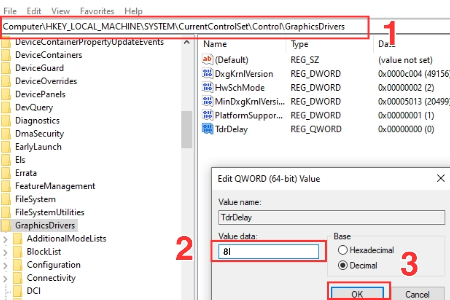 Bước 3: Tạo một giá trị DWORD mới có tên TdrDelay và đặt giá trị là 8 và khởi động lại máy tính.