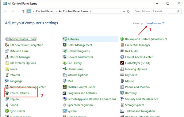 - Bước 4: Trong cửa sổ Bảng điều khiển, chọn tùy chọn "Small icons" và sau đó chọn "Power Options".