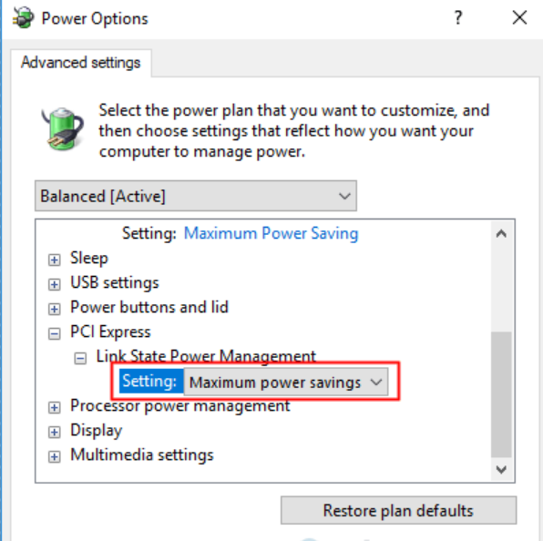 - Bước 7: Tiếp theo, mở rộng "PCI Express" và tìm tùy chọn "Link State Power Management". Thay đổi cài đặt thành "Maximum power savings".