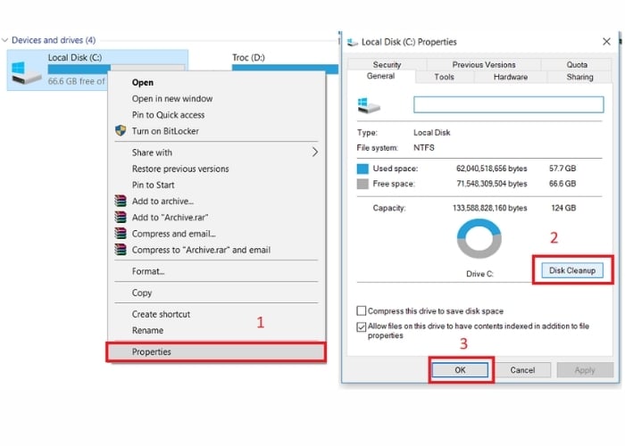 Sửa lỗi Bad Sector bằng công cụ Disk Clean: Đây là công cụ có sẵn trong máy tính, hỗ trợ khắc phục vấn đề lỗi ổ cứng laptop Dell mắc lỗi Bad Sector. Cách thực hiện: This PC → Chọn ổ đĩa cần khắc phục → nhấn chuột phải → chọn Properties → chọn General → chọn Disk Clean → nhấn OK.