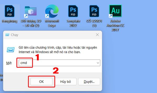 - Bước 2: Trong hộp thoại Run, nhập từ khóa "cmd" vào ô Open, sau đó nhấn Ok.