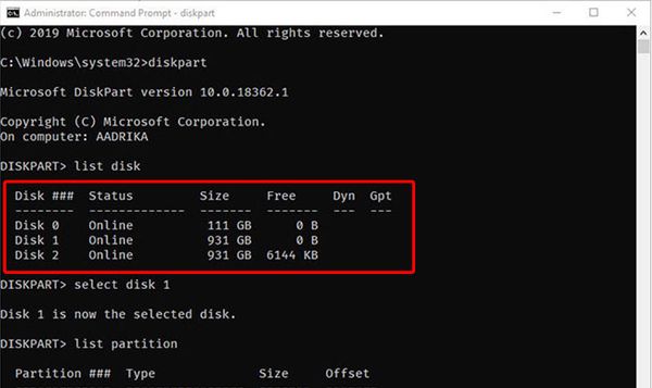 - Bước 5: Sau khi xác định được số ổ đĩa tương ứng, nhập lệnh "select disk X" (thay X bằng số ổ đĩa).