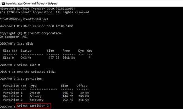 - Bước 6: Tiếp theo, nhập "list partition" để liệt kê các phân vùng trên ổ đĩa. Bạn cần chọn phân vùng hệ thống chứa Bootloader.