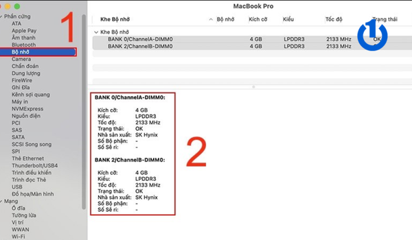 Trong trường hợp không có thông tin xuất hiện thì Macbook của bạn không thể nâng cấp được RAM. Để xem thông tin chi tiết hơn bạn tiếp tục chọn vào mục “Báo cáo Hệ thống” → Sau đó chọn mục “Bộ nhớ”. Tại đây sẽ xuất hiện đầy đủ các thông tin về dung lượng RAM, có bao nhiêu thanh,...