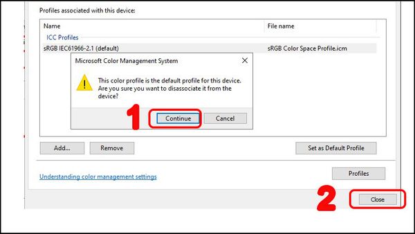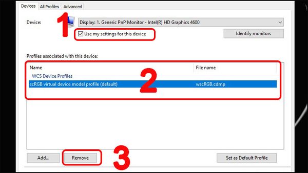 Bước 2: Ngay mục “Devices”, tích vào ô vuông “Use my settings for this device”, lúc này ngay mục “Profile associated with this device” sẽ xuất hiện tên của cấu hình màu đang dùng, kích vào và nhấn chọn “Remove”.