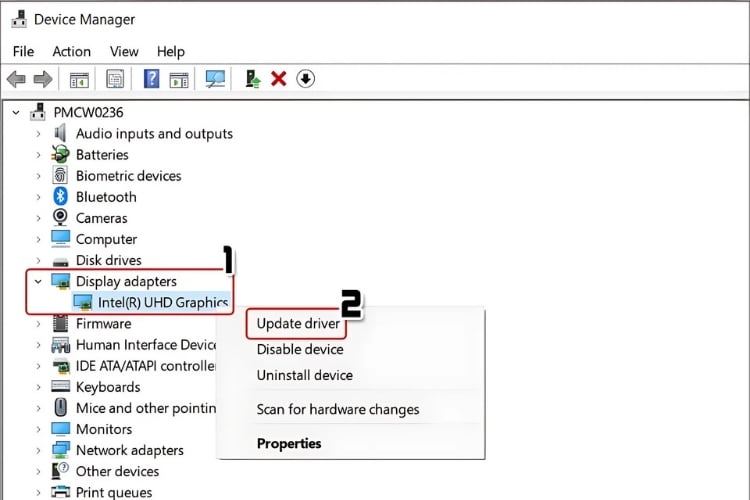 Bước 2: Chọn mục “Display adapter” rồi nhấn chuột phải vào card màn hình NVIDIA rồi chọn “Update Driver”.