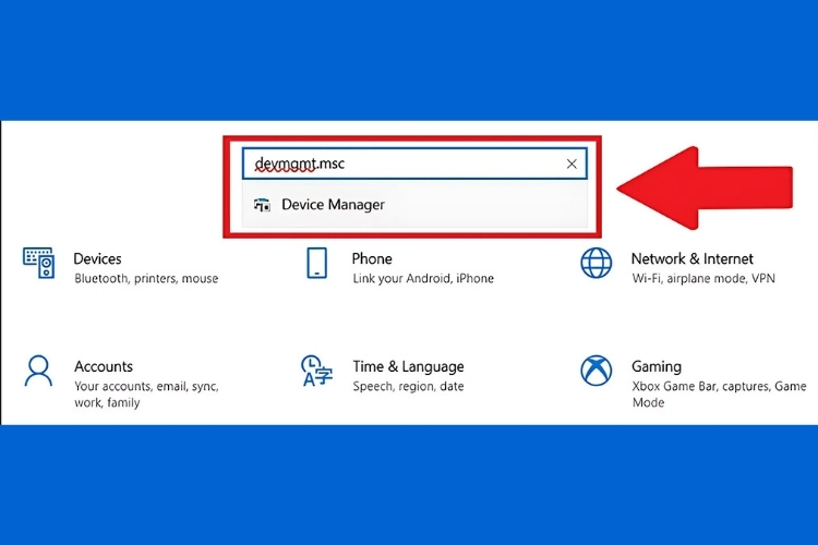 Bước 1: Nhấn tổ hợp phím “Windows + I” rồi nhập “devmgmt.msc” ở trong mục tìm kiếm rồi chọn “Device Manager”.