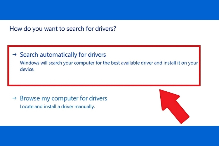 Bước 4: Chọn mục “Search Automatically for drivers” để máy tính có thể tìm quét Driver mới và tự động cài đặt là hoàn thành.
