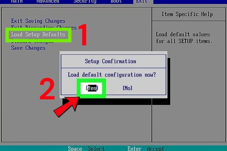 Bước 2: Tìm mục “Reset to Default” hoặc “Load Setup Defaults” hoặc “Factory Default” hoặc “Setup Defaults” > chọn Yes để đưa BIOS về trạng thái gốc.
