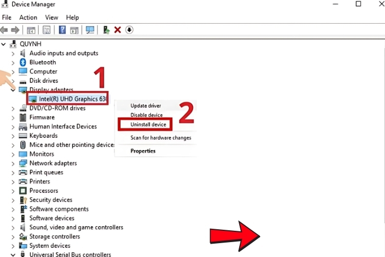 Vào mục Device Manager, chọn Display Adapters và chọn Uninstall device