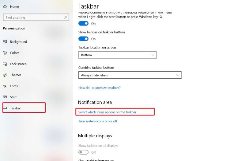 Bước 2: Vào Personalization chọn Taskbar và ấn Select which icon appear on taskbar.
