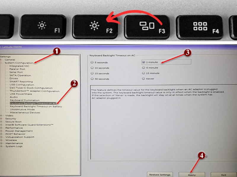 Một số dòng máy sẽ có 3 mức độ: tắt, sáng vừa, và sáng tối đa, hoặc tùy chỉnh trong BIOS tại mục Keyboard Backlight như hướng dẫn ở trên. Nếu các tùy chọn trên không hoạt động, kiểm tra xem máy bạn có hỗ trợ đèn bàn phím hay không và đảm bảo rằng driver liên quan đã được cài đặt đầy đủ.