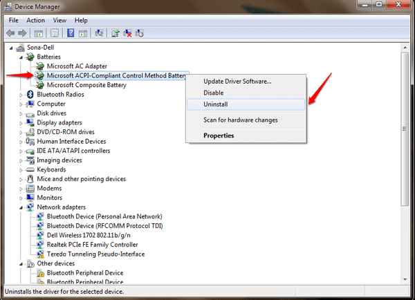 Bước 2: Khởi động lại laptop -> xóa Driver ACPI: "Control Panel" -> "Device Manager" -> "Batteries" -> "Uninstall" tất cả.