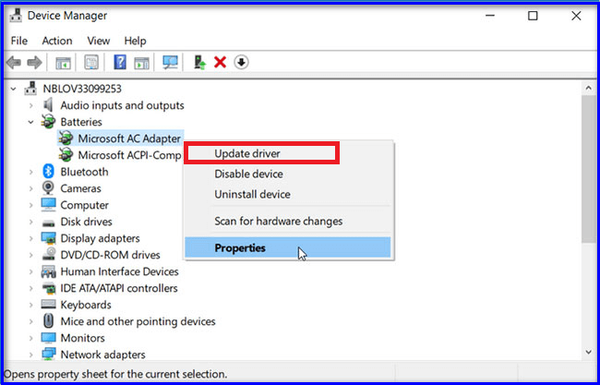 "Batteries" -> "Update Driver"
