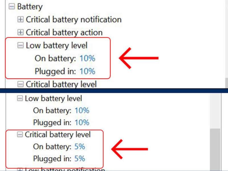 Việc điều chỉnh mức 10% (Low Battery Level) và 5% (Critical Battery Level) trong cài đặt pin là cách giúp laptop hoạt động hiệu quả.