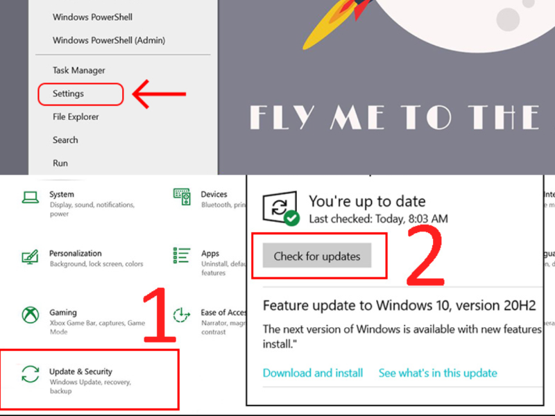 Bước 2: Chọn Update & Security sau đó Check for updates.