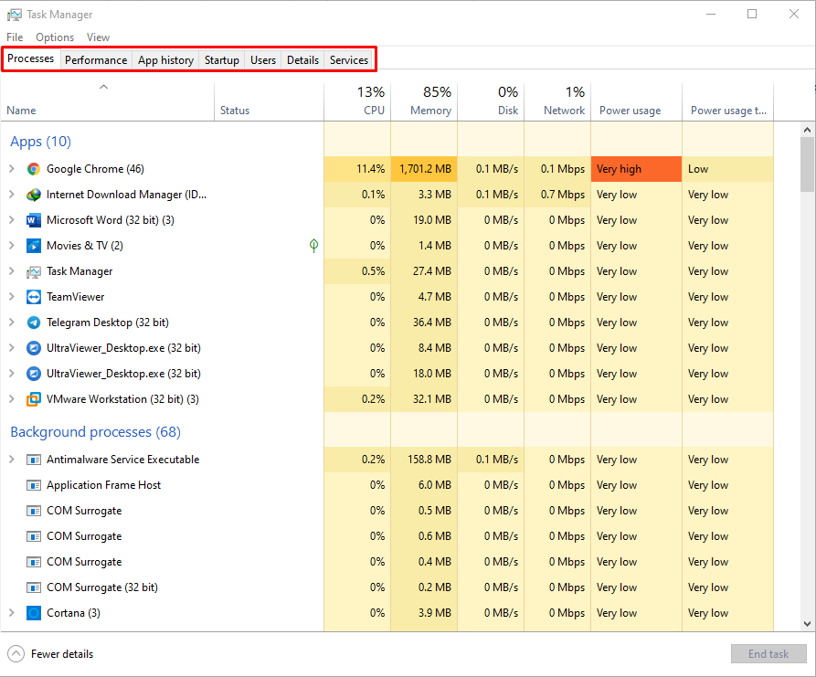 - Bước 2. Trong tab "Processes" (Tiến trình), xem danh sách các ứng dụng đang hoạt động và lượng RAM mà chúng đang chiếm dụng.