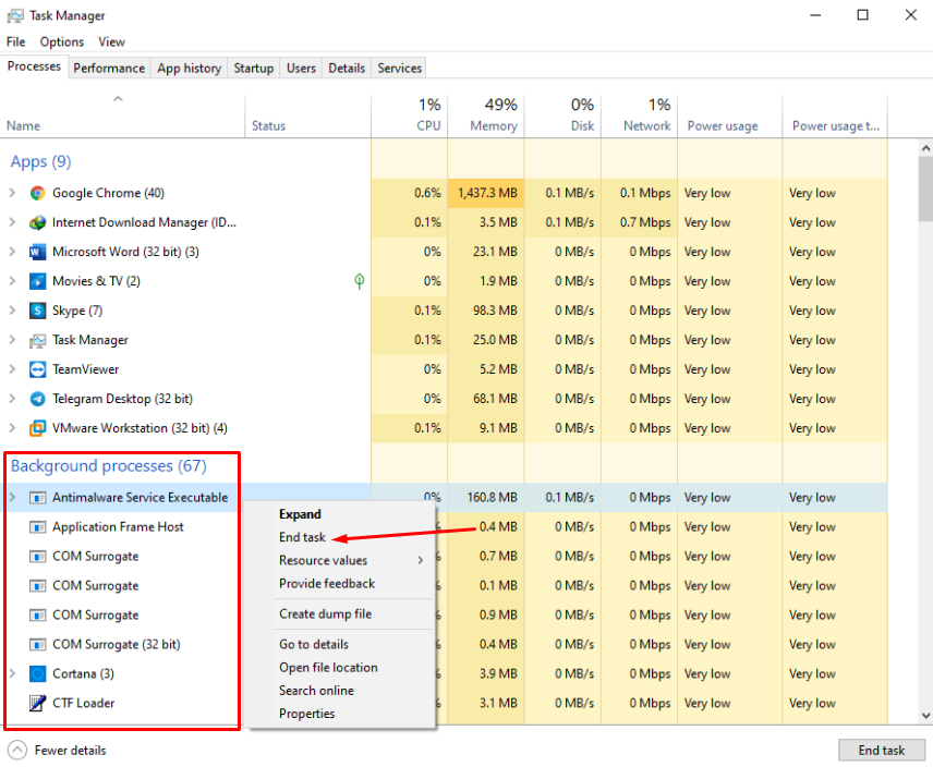- Bước 3. Nhấn chuột phải vào các ứng dụng không cần thiết và chọn "End task" (Kết thúc tác vụ) để đóng chúng, giảm bớt gánh nặng cho RAM.