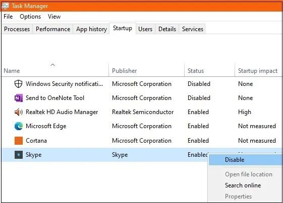 - Bước 3. Nhấn chuột phải vào các ứng dụng không cần thiết và chọn "Disable" (Tắt) để ngăn chúng khởi động cùng Windows, giúp giảm bớt tiêu thụ RAM.