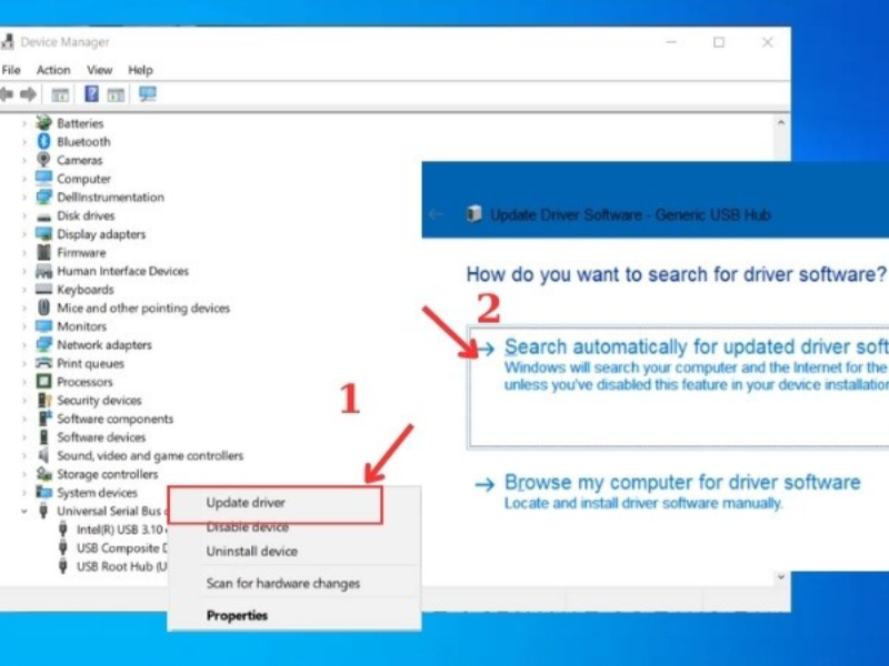 Bước 3: Chọn Update device và khởi động lại máy tính, Windows sẽ tự động cài lại driver cho các cổng USB.