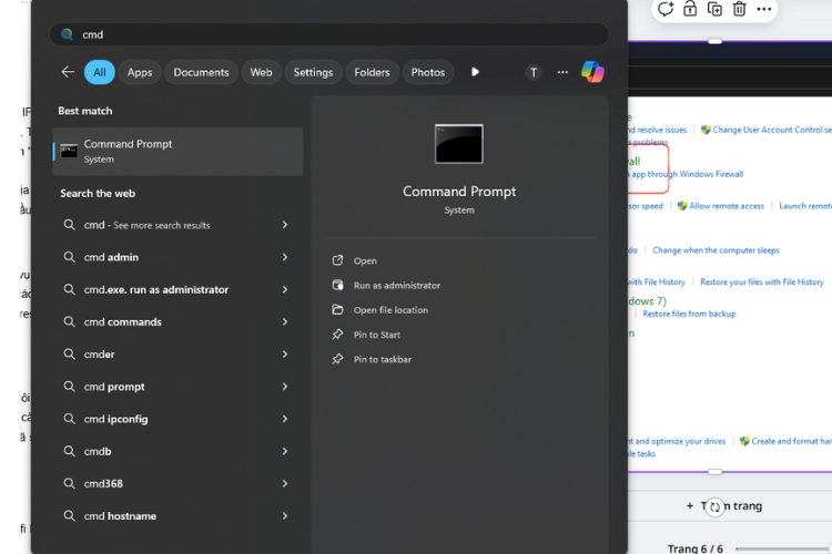 Bước 1: Mở Command Prompt bằng cách tìm kiếm "cmd" trên thanh tìm kiếm của Windows và chạy với quyền admin.