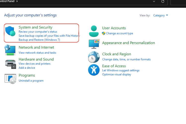 Bước 1: Mở thanh tìm kiếm Windows, gõ Control Panel và chọn mục "System and Security".