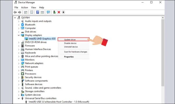 Bước 2: Trong cửa sổ Device Manager, tìm và mở rộng danh mục Display adapters. Tiếp theo, nhấp chuột phải vào tên card màn hình của bạn và chọn Update driver.