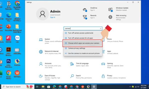 Bước 1: Truy cập thanh tìm kiếm nằm phía dưới thanh Menu, sau đó nhập từ khóa Camera. Tiếp theo, chọn tùy chọn Choose which apps can access your camera.