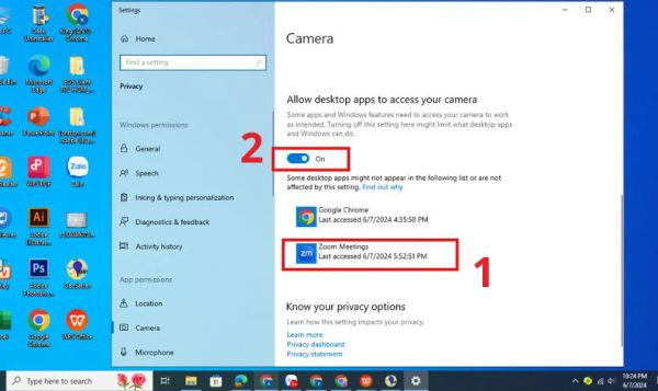 Bước 2: Khi cửa sổ cài đặt hiển thị, tìm ứng dụng Zoom Meetings và kiểm tra xem nút chuyển đổi của ứng dụng này có đang được bật (ON) hay không. Nếu chưa, hãy chuyển nút sang chế độ ON để cho phép Zoom truy cập camera.