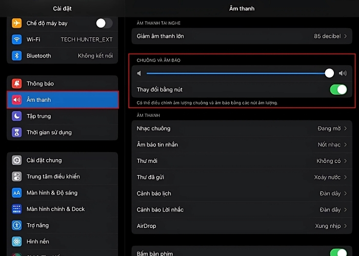 Bước 2: Sau đó tìm và chọn mục “Âm thanh”. Trong phần “Chuông và âm báo”, bạn kéo thanh âm lượng lên mức tối đa để hoàn tất.