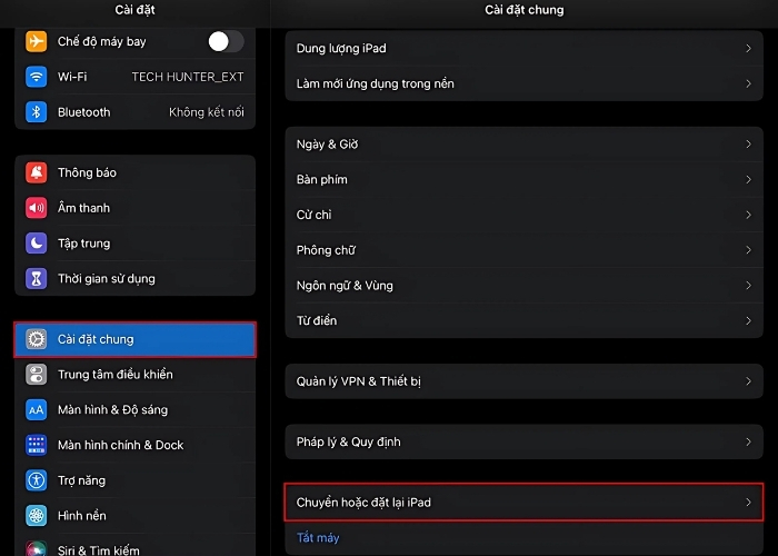 Vào mục “Cài đặt chung” và nhấn chọn “Chuyển hoặc đặt lại iPad”