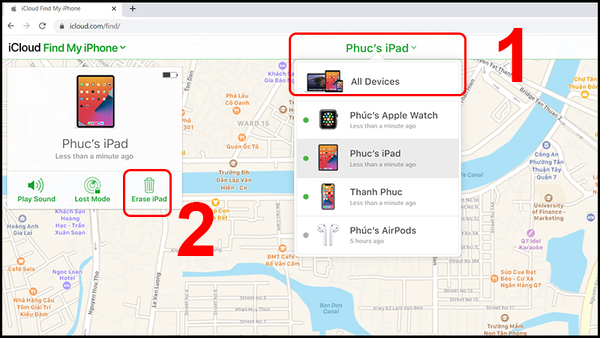 Bước 2: Ở mục “All Devices” góc trên màn hình → Chọn “iPad” → Click chuột vào “Erase iPad” và bạn cần đợi vài phút để iPad bắt đầu xóa và iPad của bạn sẽ được vô hiệu hóa.