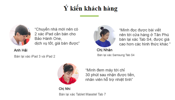 Không chỉ thu mua xác Tablet với giá tốt nhất mà còn mong muốn cải thiện chương trình ngày một tốt hơn. Bảo Hành One luôn lắng nghe ý kiến trước, trong và sau khi khách hàng trải nghiệm chương trình. Dưới đây là 3 nhận xét ngẫu nhiên của khách hàng về chương trình thu mua xác Tablet mà chúng tôi ghi nhận được.