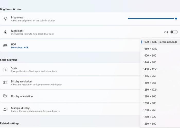 Cách kiểm tra: Chuột phải vào màn hình desktop → Display settings → Mục Display resolution. Chọn độ phân giải màn hình mà bạn đang sử dụng, ví dụ: 1920 x 1080 hoặc 2560 x 1440.