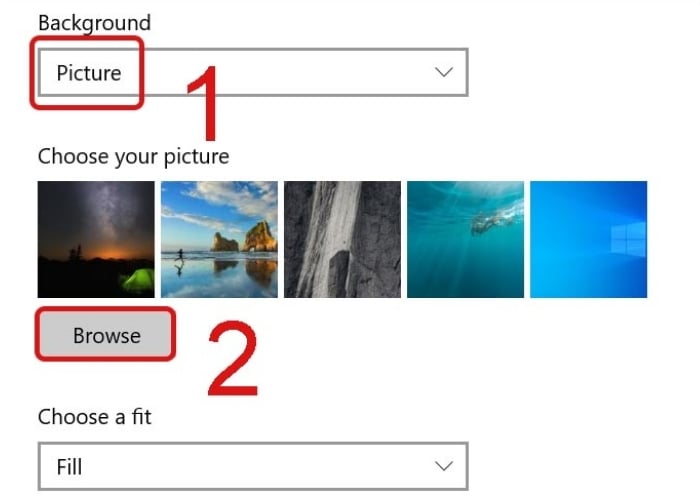 Bước 3: Tại phần Background, chọn Picture, rồi nhấn Browse để tải hình ảnh từ máy tính của bạn.