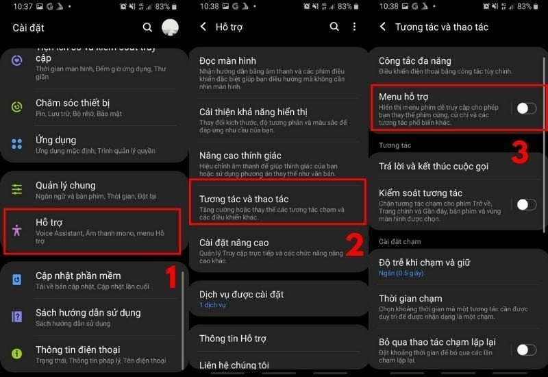 - Kích hoạt Menu: Vào Cài đặt, chọn mục Hỗ trợ, tiếp tục vào Tương tác và thao tác rồi gạt bật tính năng Menu hỗ trợ hiện lên trên màn hình máy.