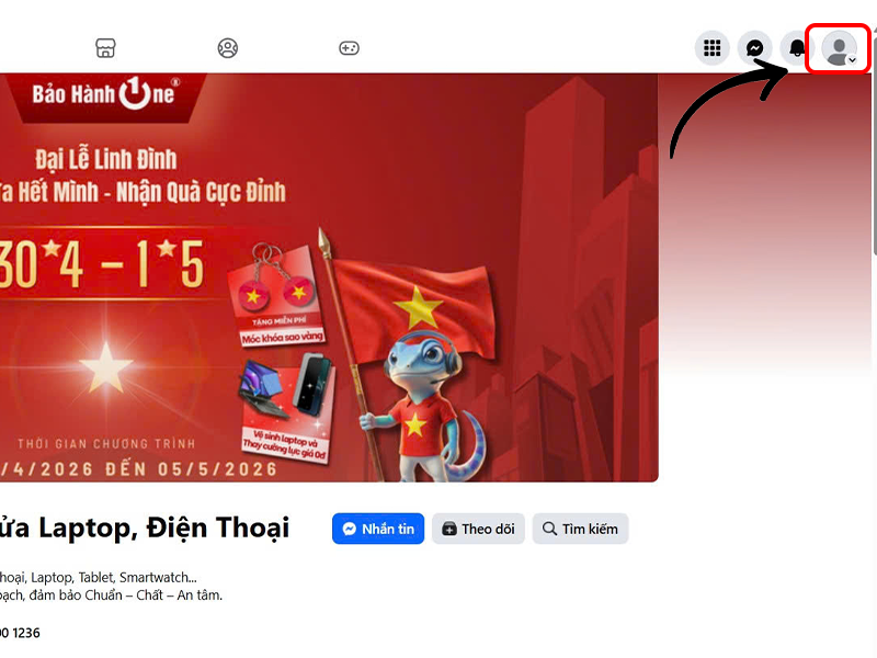 - Bước 1: Truy cập Facebook bằng trình duyệt, nhấn vào ảnh đại diện của bạn ở góc trên bên phải.