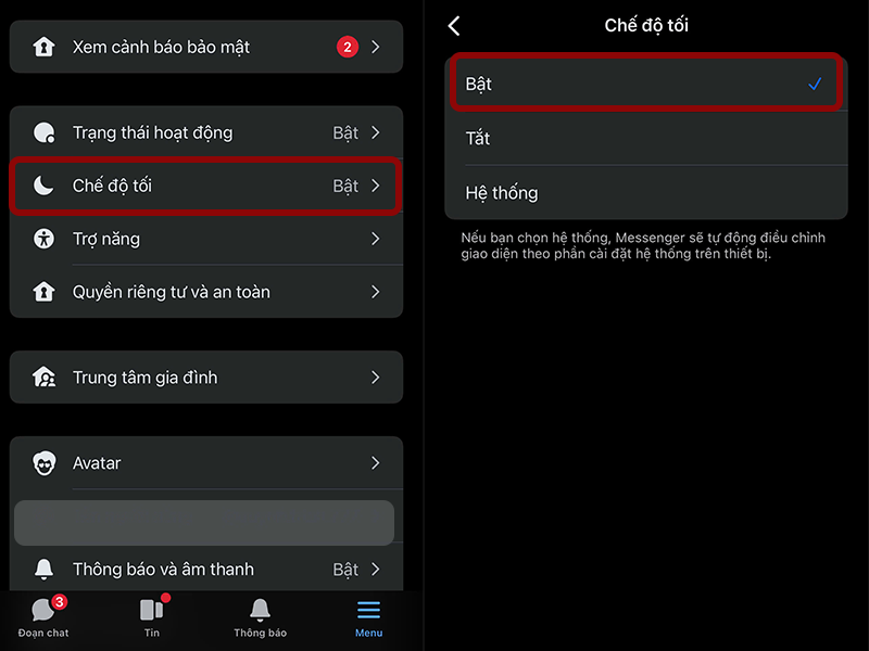 - Bật trên Messenger di động: Nhấn vào ảnh đại diện góc trên bên trái, chọn mục “Chế độ tối” ngay đầu tiên. Sau đó bạn nhấn chọn "Bật" để các cuộc hội thoại trở nên dịu mắt hơn khi chat đêm.
