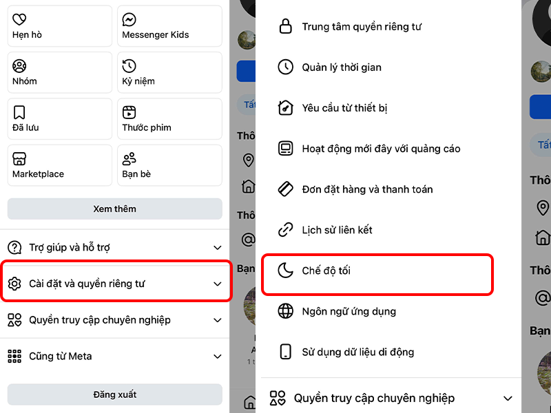 - Bước 2: Kéo xuống dưới cùng để tìm mục “Cài đặt & quyền riêng tư” và chọn “Chế độ tối”.