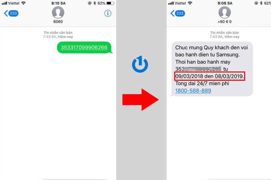 Bước 2: Nhấn gửi đến tổng đài 6060. Đợi vài phút (3-5 phút) để nhận tin nhắn thông tin bảo hành của thiết bị Samsung trả về, nếu bạn đã thực hiện đúng cú pháp nêu trên.