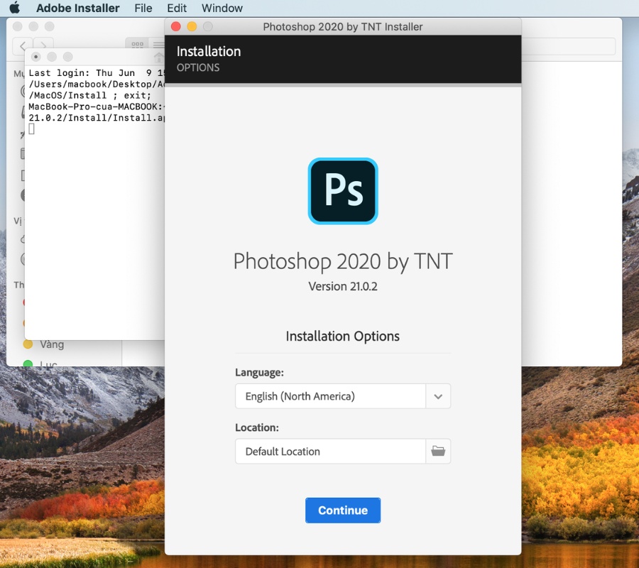 Để tiếp tục quá trình cài đặt photoshop hãy nhấn vào Continue. Sẽ có một vài trường hợp khi bạn bấm vào lần 1 nó có thể sẽ báo lỗi. Nếu như vậy bạn không cần lo lắng, hãy thoát ra rồi thử lại từ đầu. Đa phần cách này sẽ thành công.