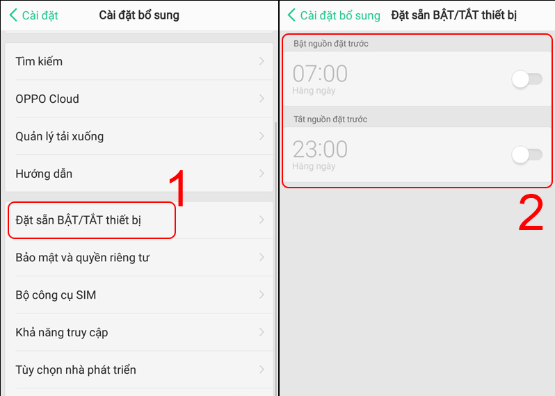 - Tính năng hẹn giờ tắt máy: Vào Cài đặt => Cài đặt bổ sung => Đặt sẵn BẬT/TẮT thiết bị để thiết lập khung giờ máy tự tắt mà không cần bấm phím.