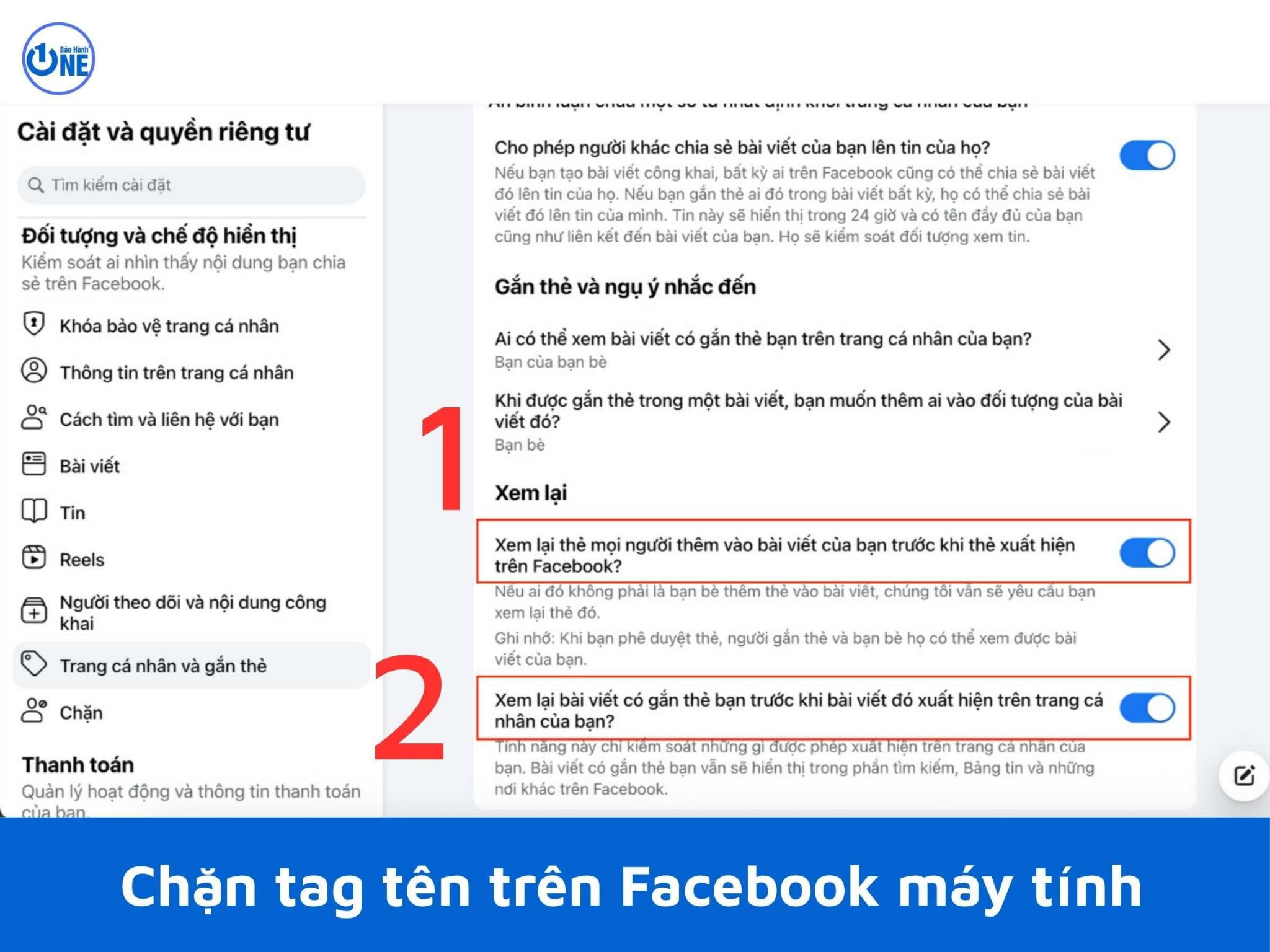 - Bước 3: Tại mục xem lại, hãy bật tùy chọn Xem lại thẻ được gắn vào bài viết và Xem lại bài viết có gắn thẻ bạn trước khi hiển thị công khai trên Facebook.