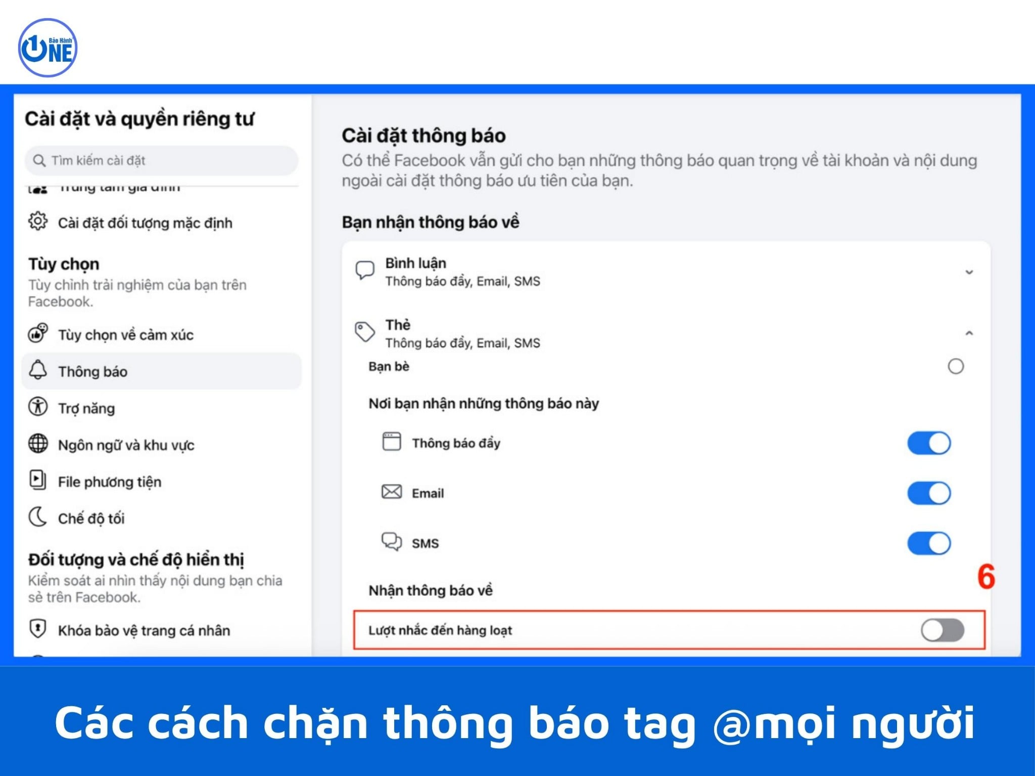 - Bước 3: Kéo xuống dưới, tại mục Nhận thông báo về bạn sẽ thấy có tùy chọn Lượt nhắc đến hàng loạt. Tắt công tắc nằm bên cạnh tùy chọn.